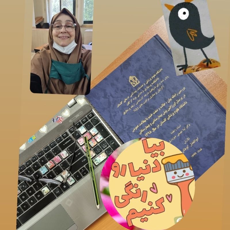 بیا دنیا را رنگی کنیم Let's color the world موضوع پایان نامه در باره بیان، حالت و صفت خشم در پرسنل اورژانس پیش بیمارستانی و بیمارستانی بوده است از روش های مدلسازی آماری پیشرفته استفاده شد و مقاله شان هم در مجله پرستاری و مامایی مازندران با نمایه اسکوپوس و ای اس ای پذیرفته شد هیجده از هیجده نمره پایان نامه و دو نمره هم برای مقاله با نمایه سطح یک