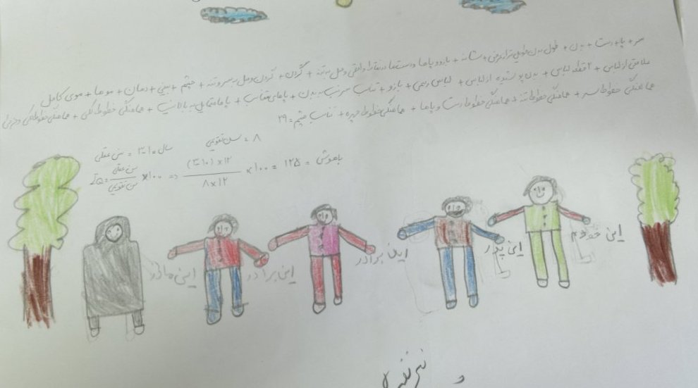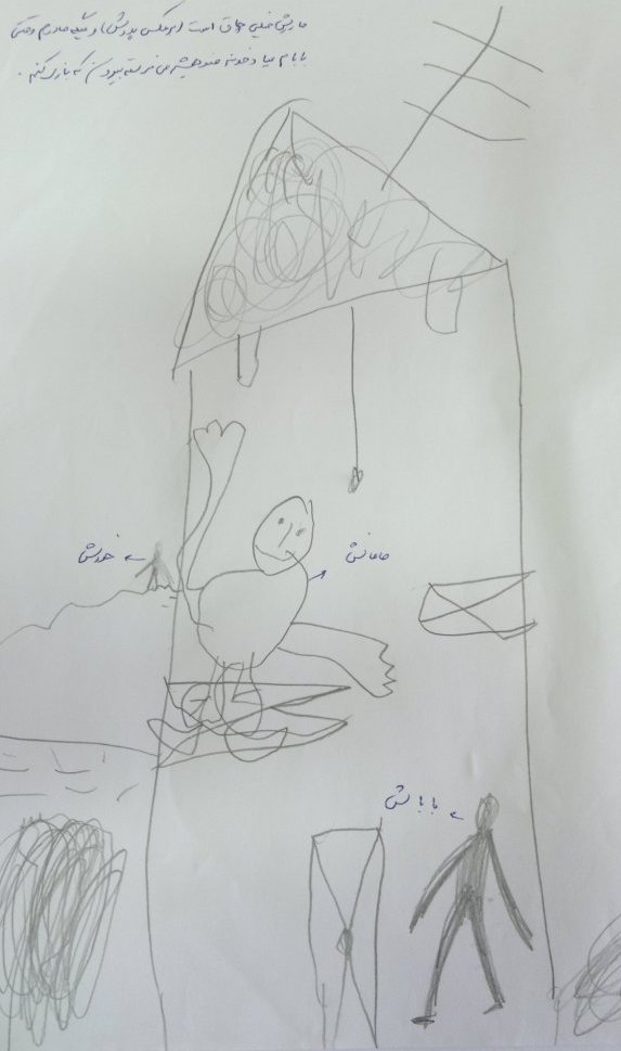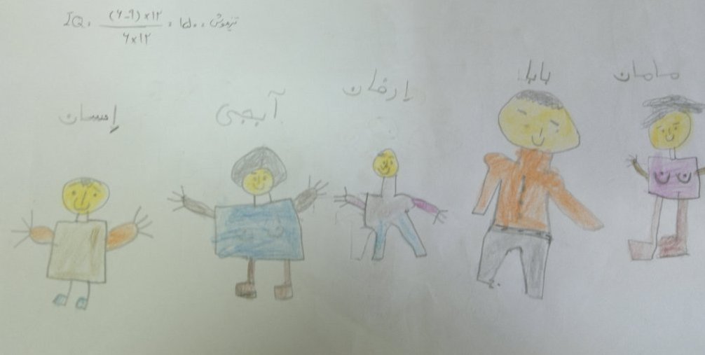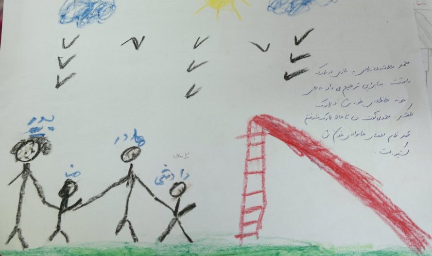البته اجرای این تست مستلزم رعایت مواردی است و تفسیر تست نیز بایستی با احتیاط صورت گیرد. در هر حال از تست ترسیم خانواده می توان برای پی بردن آنچه در ذهن کودک می گذرد تا حدودی مطلع شد. برای مثال در نقاشی هایی که ملاحظه می نمایید در یک مورد کودک پارک را می کشد و می گوید تا کنون پارک را ندیده ام/ نرفته ام و دوست دارم با پدرم به پارک بروم